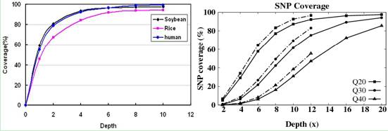 测序深度与基因组覆盖度之间是一个正相关的关系,而测序带来的错误率或变异检测(例如,SNP)假阳性结果会随着测序深度的提升而下降。在图2中可以看到当测序深度达到10x时基因组的覆盖度已接近饱和(左图)。但在测序深度达到10X的时候,SNP的检测率却没有达到饱和。